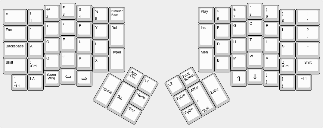 • Layer 2 is qwerty (for easier gaming & less fortunate keyboard users)