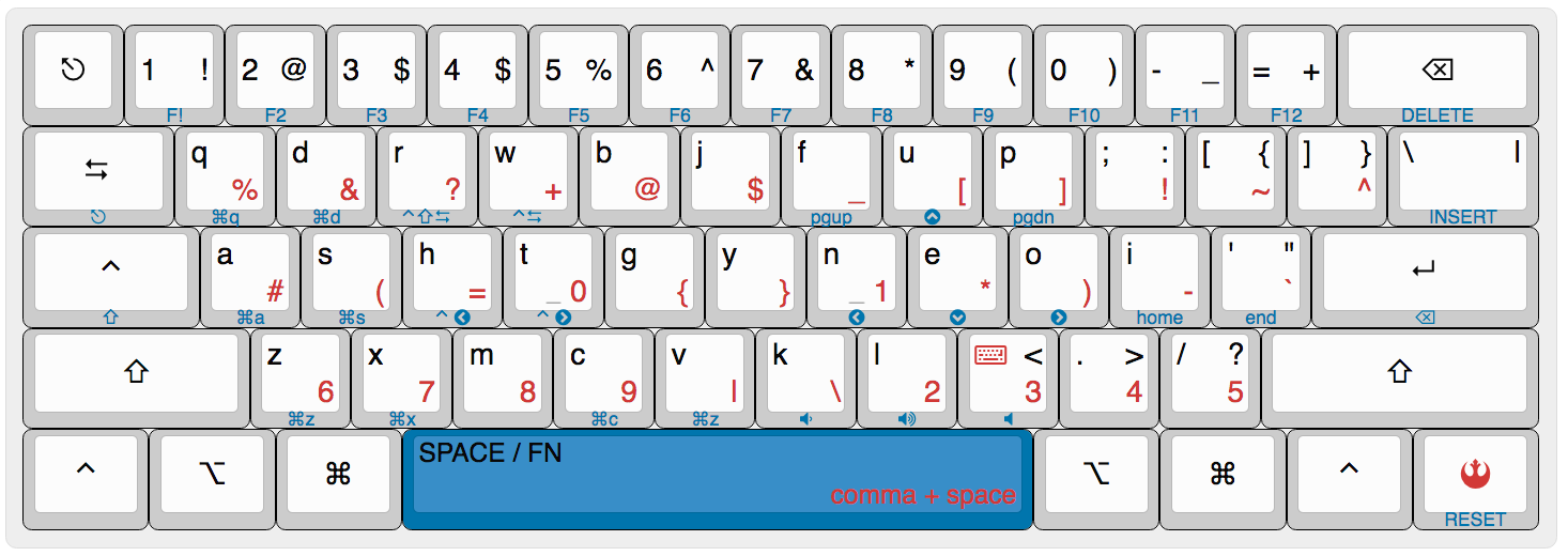 workman(try it out, it's awesome!), but it can be changed toqwertywith therebelkey (the function layer won't change though) commaacts as a dead key, that means tapping/holding it will activate the oneshotdead keylayer (marked red in the reference)- hold